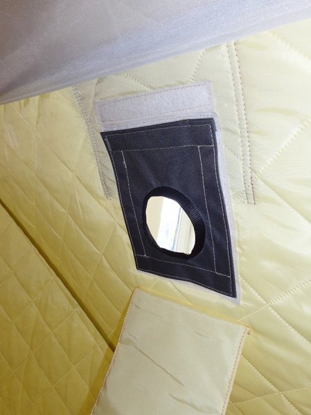 Накладка крепится к отверстию окна на контактную ленту Велкро, вместо прозрачного окошка. Такая система крепления исключает поддувание холодного воздуха в палатку.